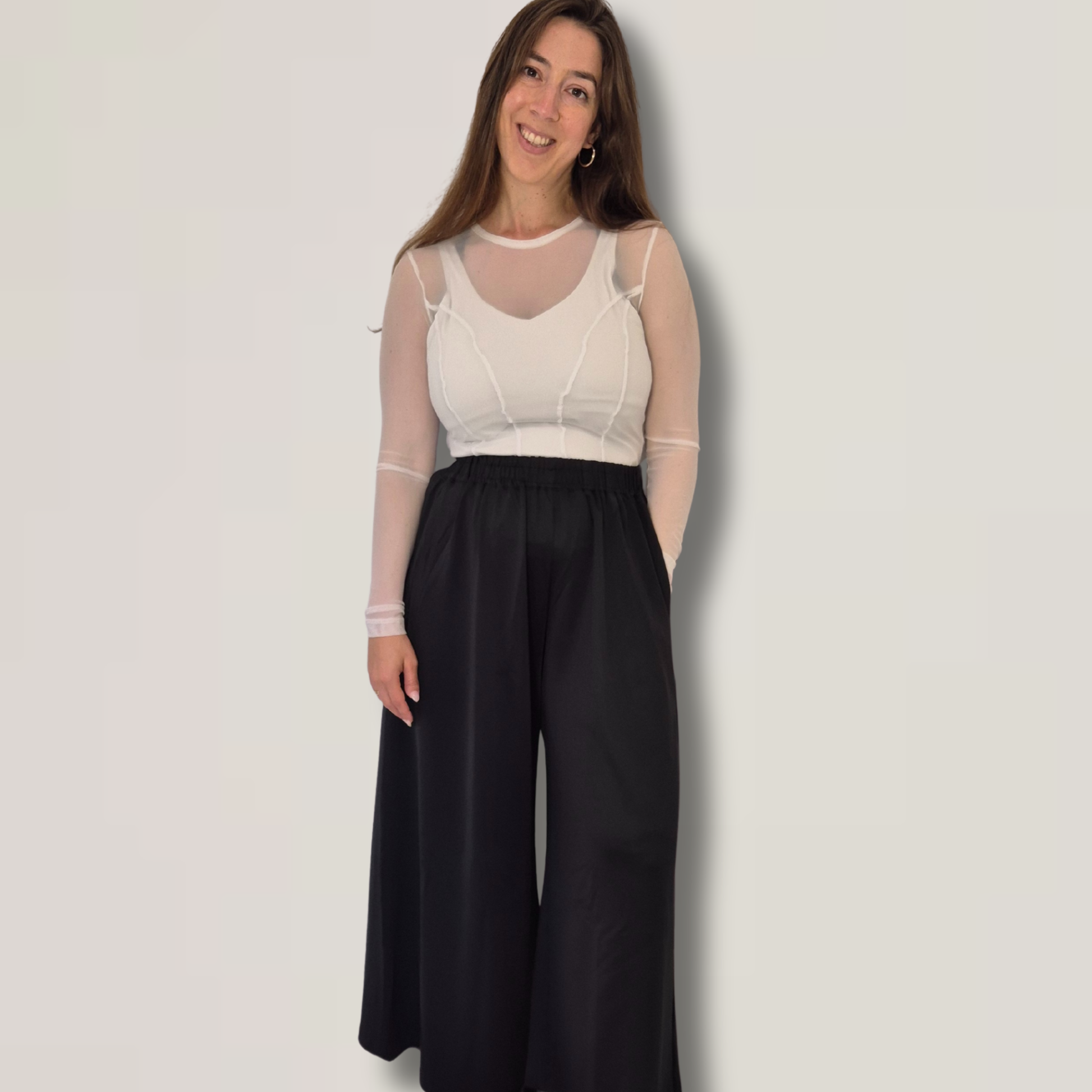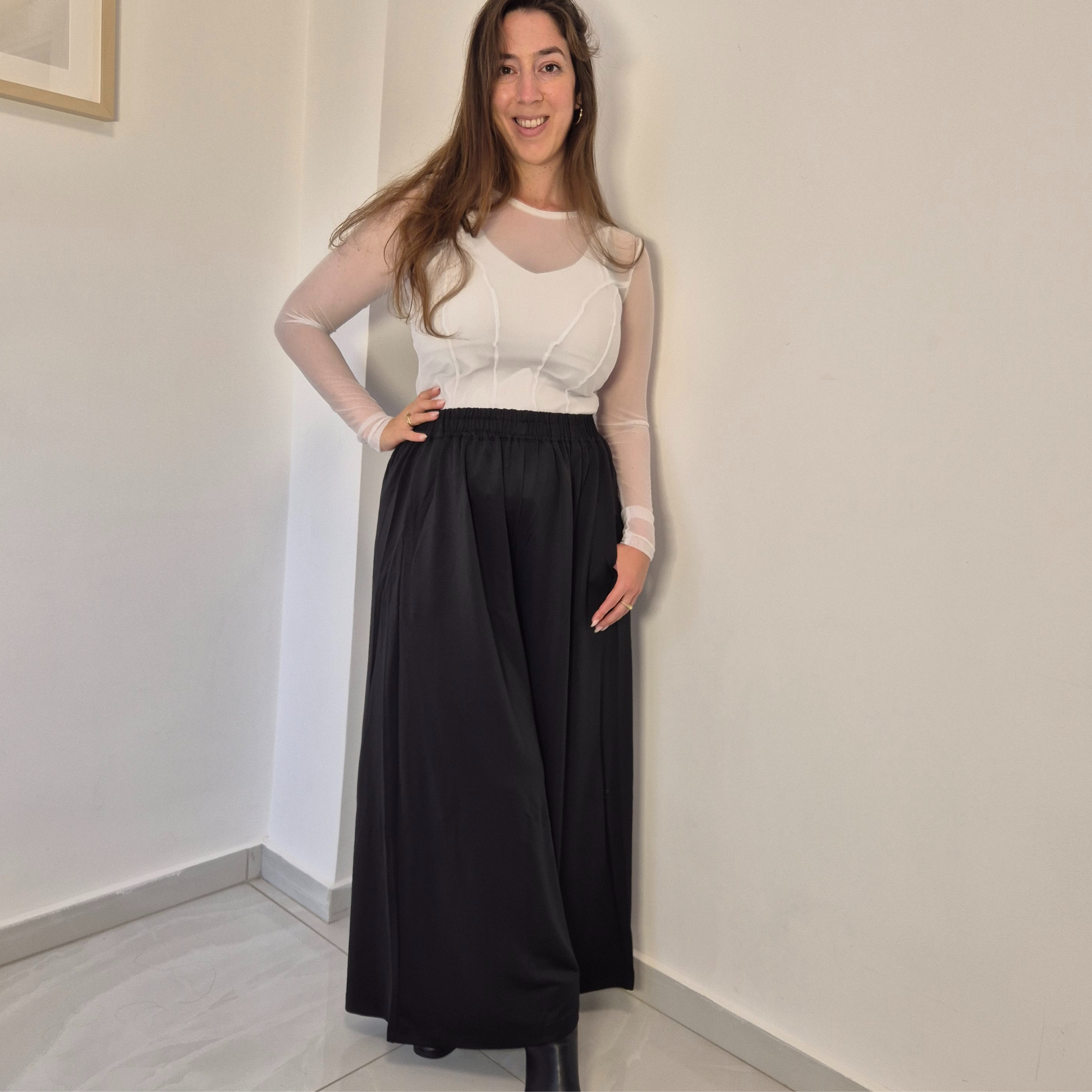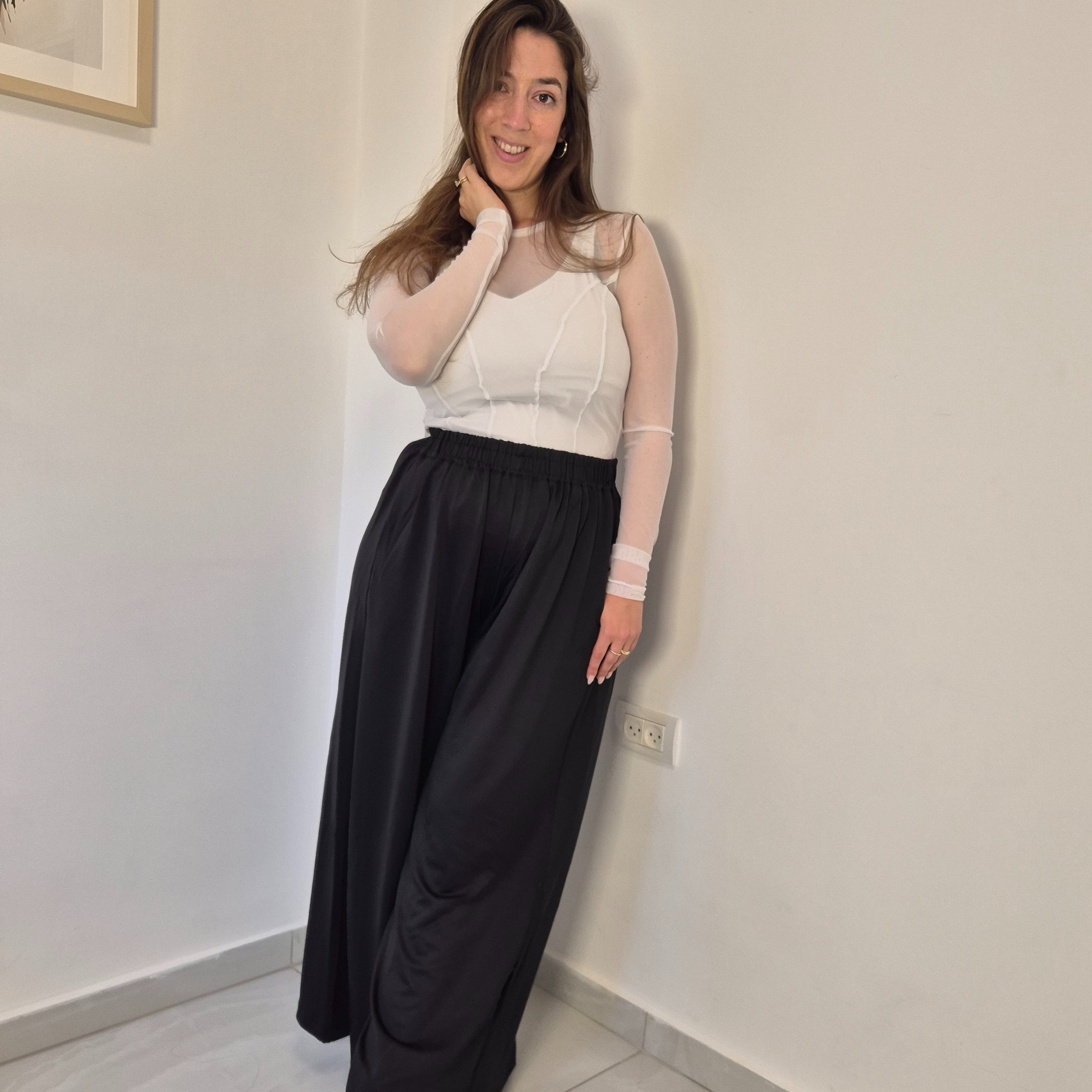 המכנסיים מבד נאון איכותי, בגזרה רחבה וזורמת, עם כיסים נוחים וגומי במותן. נעימים על הגוף, קלילים, ופריט בסיסי שכל אישה צריכה בארון.